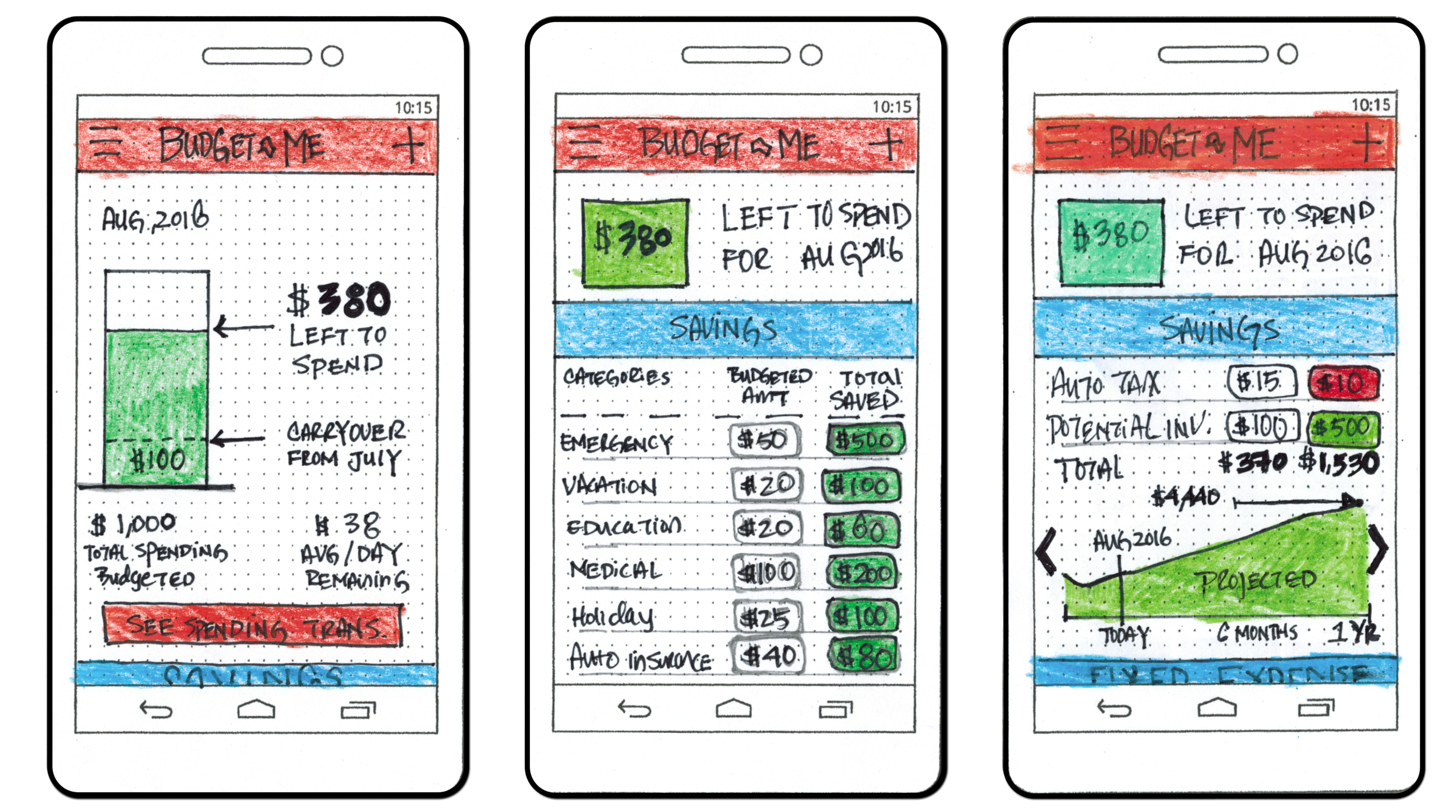 The second paper prototype tested well as users found the summary screen meaningful and the zero-sum concept apparent in the design of the Savings Input screens (two on the right). However, there are several other important flows in the application that needs to be designed to provide Budget-Me as a full mobile solution. Below are the key next steps for this project: