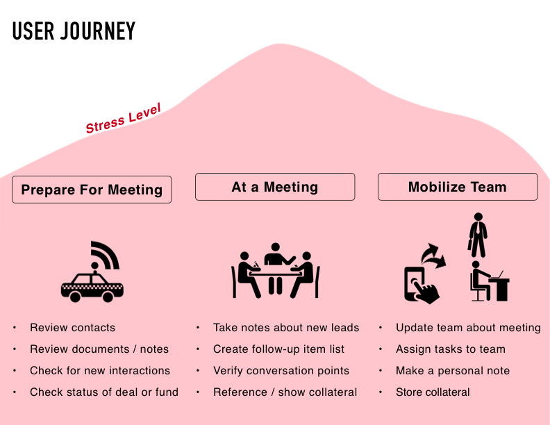 Below is the resulting archetypical user journey. In the infographic below, the peaks of stress are the major value-add opportunities for the mobile product.