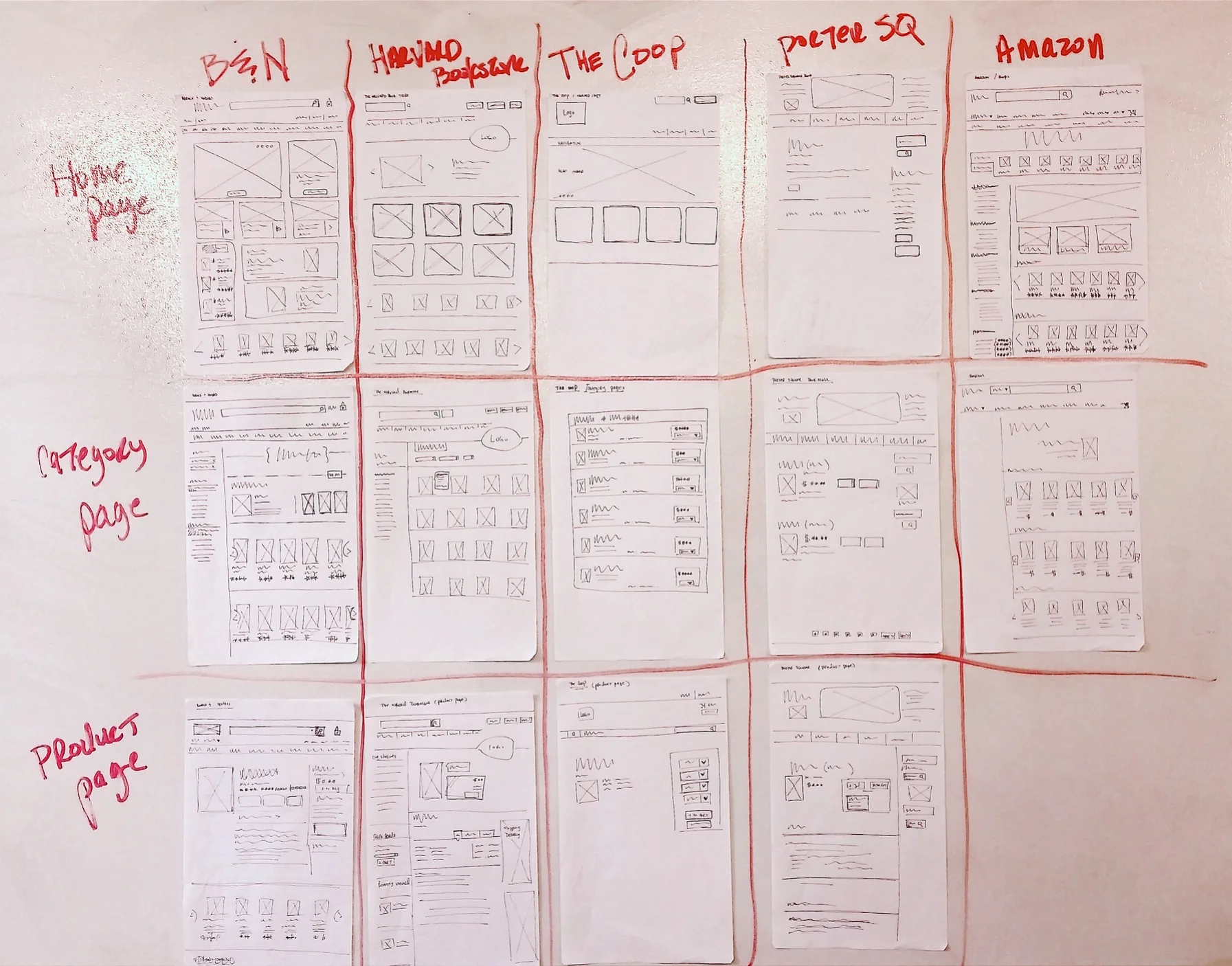Since e-commerce is a well established means of business, the ideation for Rodney’s Bookstore’s site sprouted from a thorough understanding of best practices from competitive sites. I conducted a competitor layout analysis in order to discern the successful features that can fulfill the solution strategy.