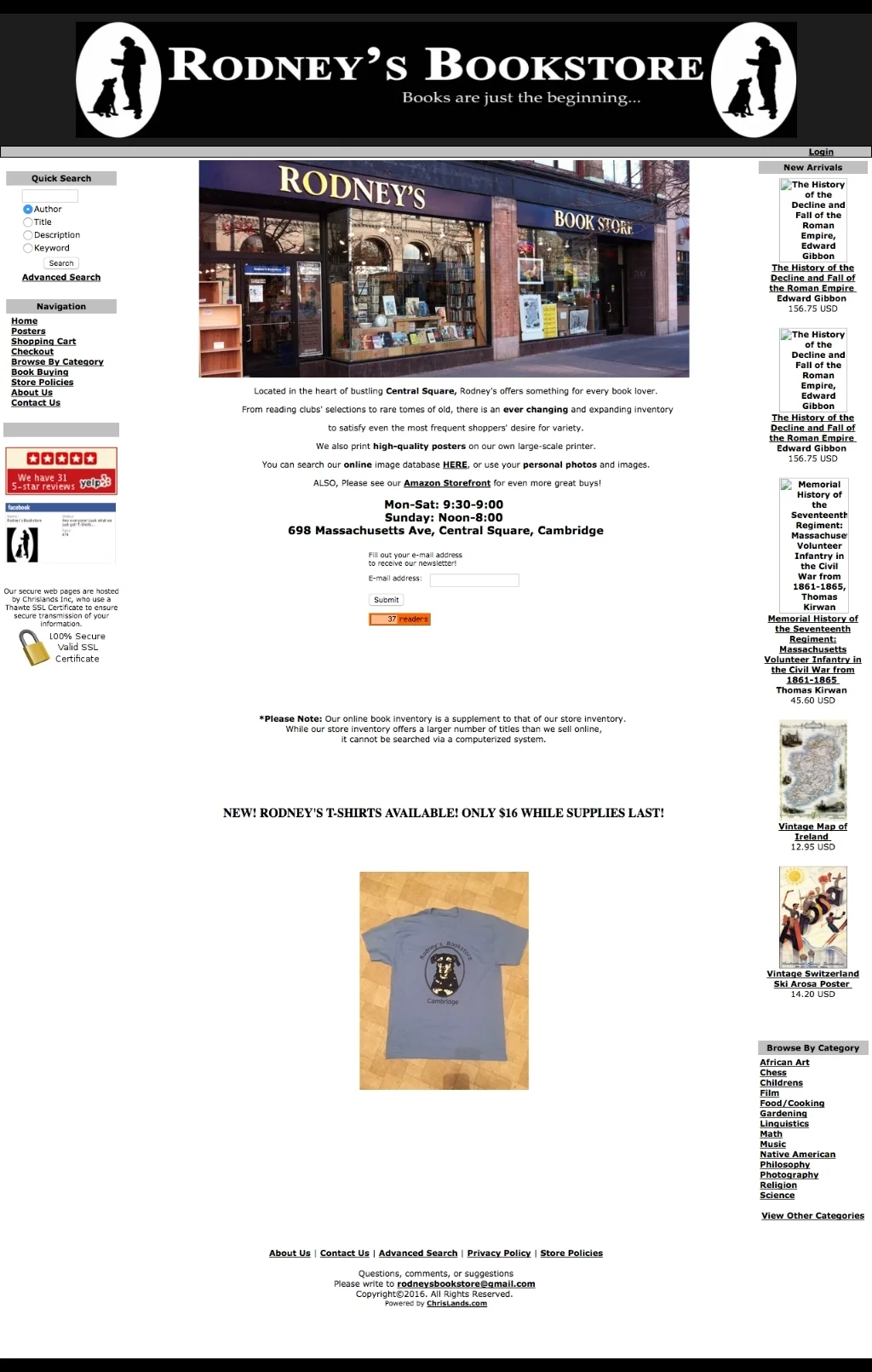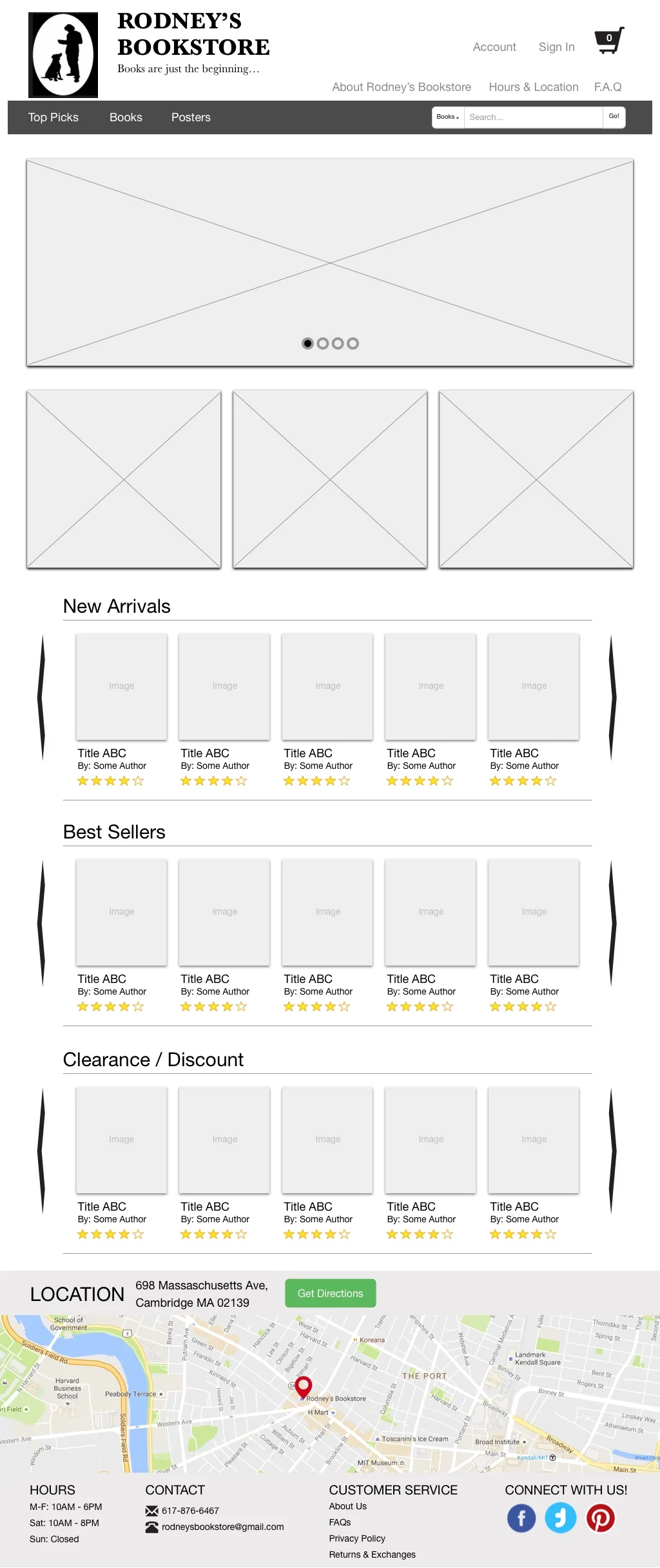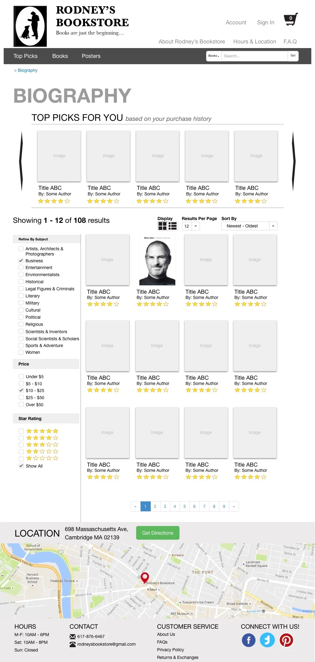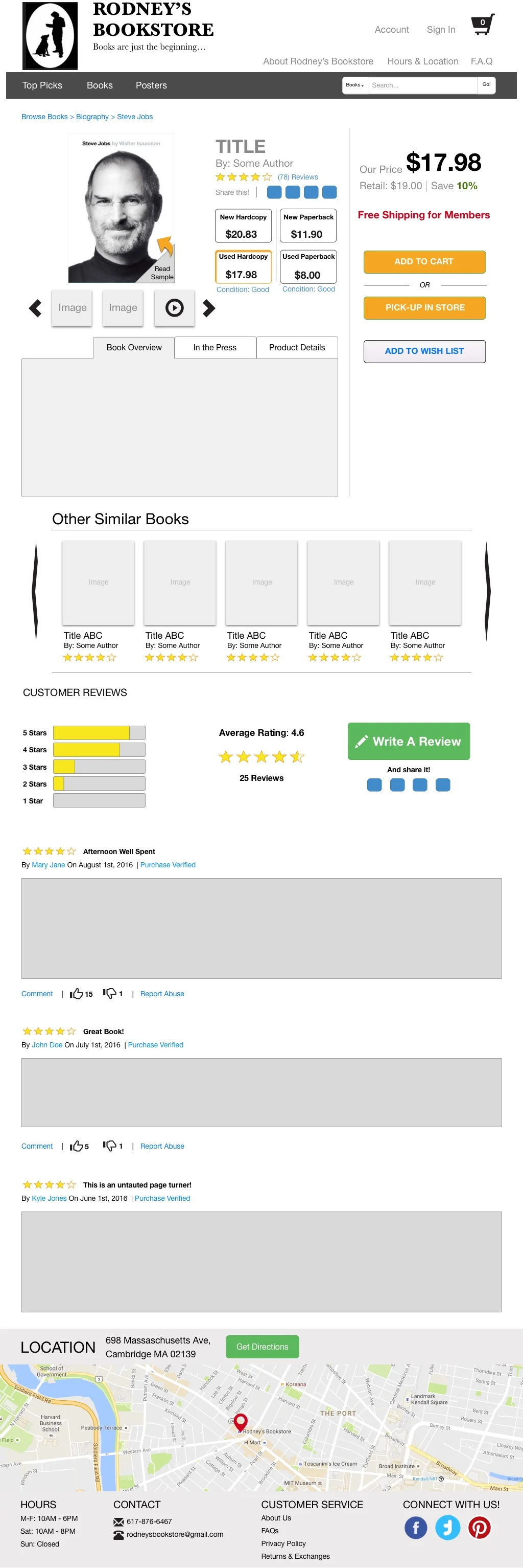 I took on the challenge of redesigning an outdated website for an independent bookstore located in Cambridge, Massachusetts. Rodney's bookstore is a charming neighborhood-centric place that managed to stay in business despite the industry takeover by E-commerce giants such as Barnes & Nobles, Amazon and Borders. The web design required balancing an efficient and contemporary E-commerce practice while conveying Rodney’s Bookstore’s competitive advantages.